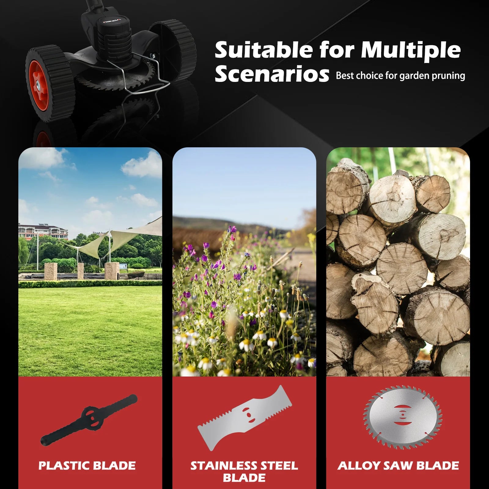 Equipped with a versatile 3-in-1 cutting system, you can switch between manganese steel circular blades, a plastic grass blade, and stainless steel blades to tackle thick shrubs, soft grass, and stubborn weeds with ease.