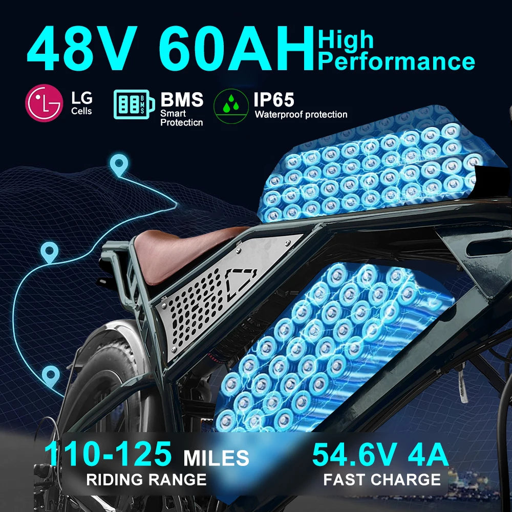 - Dual Battery System — 48V with a total capacity of 60Ah (two removable batteries) for extended exploration. Estimated range up to 160-200 km in favorable conditions with the 25Ah + 35Ah configuration.